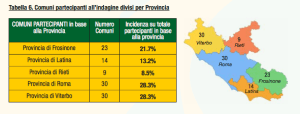 All’iniziativa hanno aderito 115 dei 378 comuni della regione Lazio, da Roma e le altre città capoluogo, ai piccoli comuni. I risultati sono stati presentati differenziandoli per provincia e per numero di abitanti del comune.