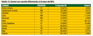 Riassumendo i dati per la nostra provincia: Frosinone si piazza all’ultimo posto tra le città capoluogo di provincia con poco più del 15 % di raccolta differenziata, il comune più virtuoso è Castelliri con quasi il 78% e il meno efficiente Collepardo con solo il 3 %.