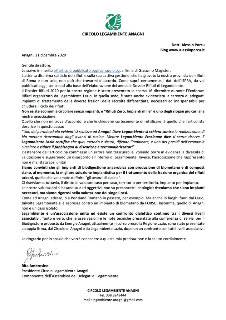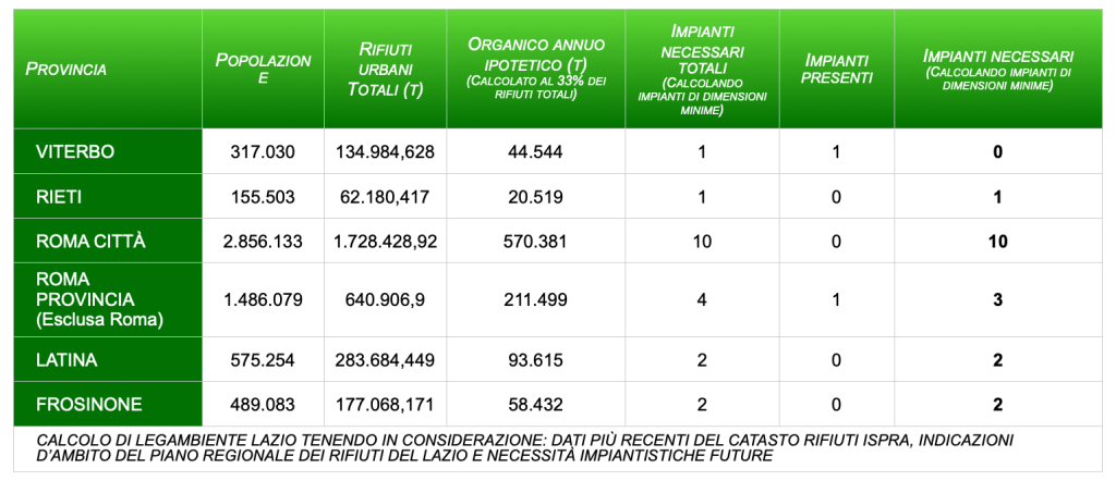 Da una recente analisi di Legambiente Lazio è emerso che “a Frosinone e provincia serviranno 2 Biodigestori, in provincia di Latina ne sta per essere costruito uno e ne servirà un secondo, a Rieti 1, a Viterbo c’è già il necessario, in provincia di Roma (senza Capitale) c’è 1 impianto e ne serviranno altri 3, a Roma non c’è niente e ne serviranno 10, se tutti di piccola taglia. Ma dovranno essere diffusi sul territorio secondo la giusta divisione tra ambiti provinciali come li ha definiti il Piano Regionale dei Rifiuti, servono a Frosinone dove il nostro circolo si espresso giustamente in maniera inequivocabile, così come altrove. Andranno fatti in aree industriali recuperando aree dismesse, senza consumo di suolo ulteriore, posizionandoli più vicino possibile ai capoluoghi o le città più grandi, per abbattere il più possibile le emissioni dei mezzi pesanti addetti al trasporto. Il calcolo è stato realizzato tenendo in considerazione i dati più recenti del catasto rifiuti ISPRA e le indicazioni d’ambito arrivate con il nuovo Piano Regionale dei Rifiuti.”