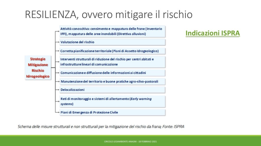 Cambiamento climatico e dissesto idrogeologico sono dunque le due facce di una stessa medaglia. Per minimizzare i rischi, le città ed i territori devono incrementare la propria resilienza agli stravolgimenti climatici, principalmente con un’accurata attività di conoscenza e di cura del territorio.