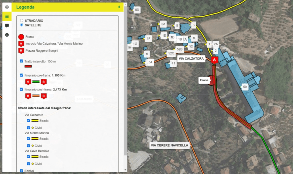 La mappa è di facile comprensione. Oltre la posizione geografica dell’evento franoso e un contatore che evidenzia in automatico i giorni trascorsi dal suo verificarsi, vi si trovano rappresentate la rete viaria coinvolta, il tratto di strada interrotto, le posizioni delle costruzioni con i relativi numeri civici.