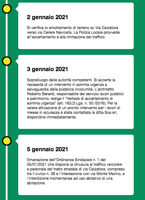A 200 giorni dall’evento abbiamo “fatto i conti” di quanto incida sulla quotidianità dei residenti la variazione di percorso obbligata dall’interruzione per frana. Tenendo conto che la frana ha impatto sulla viabilità dei residenti di 179 civici (precisamente 59 di Via Calzatora, 6 di Via Cava Bestiale e 120 di Via Monte Marino) e assumendo che ci si sposti in automobile per raggiungere Piazza Ruggero Bonghi almeno una volta al giorno, è stato possibile stimare un incremento di 82005 km in 200 giorni per l’intera comunità locale. Sono, ovviamente, dati stimati sulla base di assunzioni ipotetiche, ma cominciano a ben rappresentare il disagio di un’intera comunità.