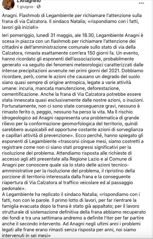A seguito del nostro flashmob, il sindaco Natalia ha dichiarato di aver risposto “con i fatti”, come si può leggere dal post de L’Anagnino del 1° giugno. Quali fatti, non è dato sapere, visto che non abbiamo ancora avuto risposta alla richiesta di accesso agli atti, ma recentemente il movimento civico Cittatrepuntozero ha sollevato la questione del mancato avvio dei lavori per il ripristino della frana, e, da quanto riportato nel loro articolo, si evince come la Regione Lazio abbia ritenuto inconsistente ed incompleta la richiesta di riconoscimento dello stato di Calamità Naturale presentata dal comune di Anagni, e pertanto non sia stato possibile dar seguito alla richiesta. Clicca qui per leggere la risposta della Regione Lazio.