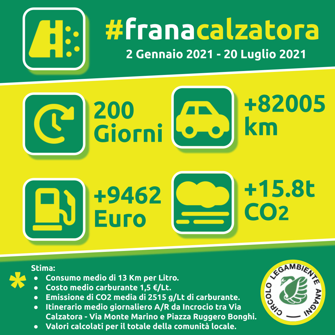 A 200 giorni dall’evento abbiamo “fatto i conti” di quanto incida sulla quotidianità dei residenti la variazione di percorso obbligata dall’interruzione per frana. Tenendo conto che la frana ha impatto sulla viabilità dei residenti di 179 civici (precisamente 59 di Via Calzatora, 6 di Via Cava Bestiale e 120 di Via Monte Marino) e assumendo che ci si sposti in automobile per raggiungere Piazza Ruggero Bonghi almeno una volta al giorno, è stato possibile stimare un incremento di 82005 km in 200 giorni per l’intera comunità locale. Sono, ovviamente, dati stimati sulla base di assunzioni ipotetiche, ma cominciano a ben rappresentare il disagio di un’intera comunità.