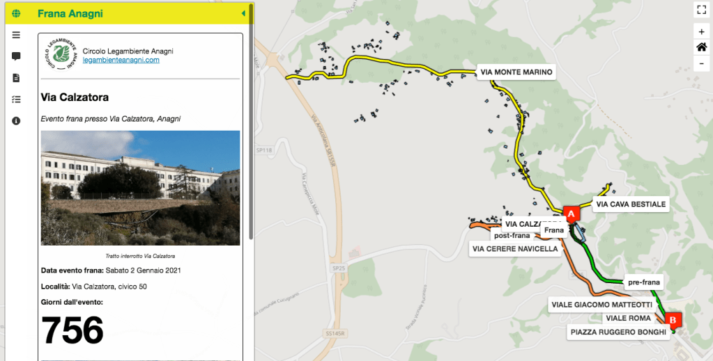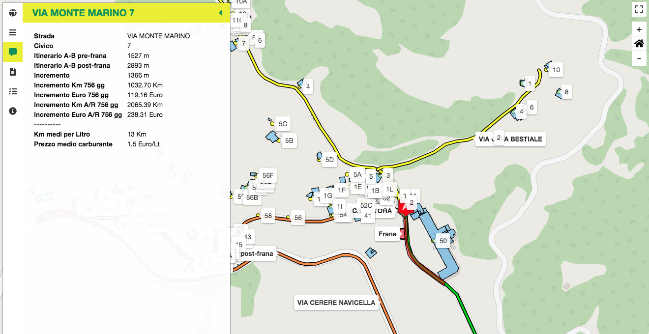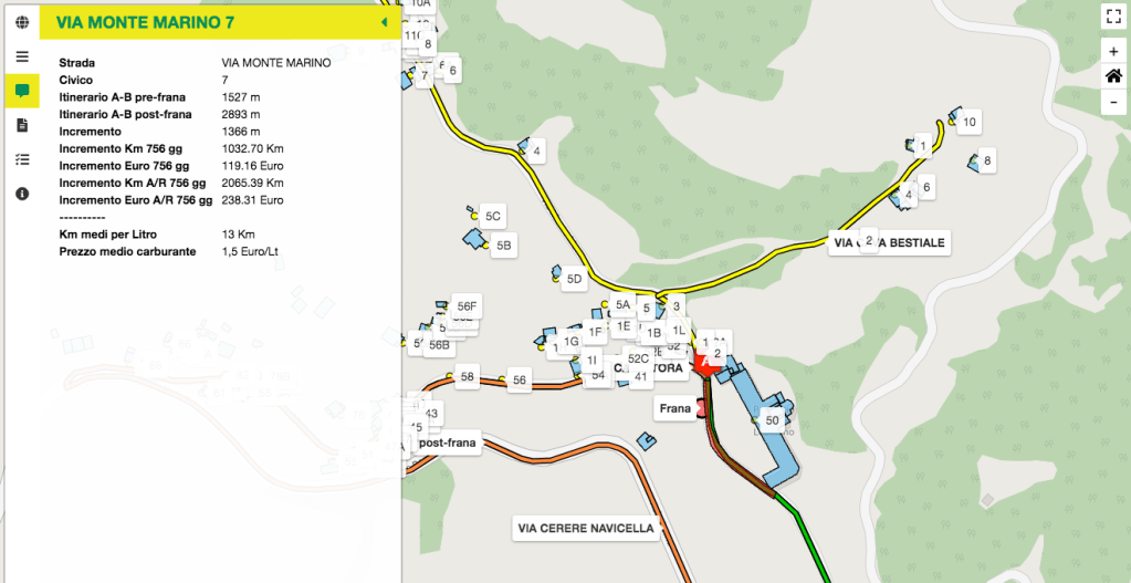 La mappa interattiva con l’algoritmo per i calcoli è stata presentata il 21 luglio del 2021, a 200 giorni dal 2 gennaio 2021, data dell’evento franoso che ha avuto ed ha tuttora impatto sulla viabilità dei residenti di 179 civici (precisamente 59 di Via Calzatora, 6 di Via Cava Bestiale e 120 di Via Monte Marino): in quell’occasione era stato stimato un incremento di 82005 km per l’intera comunità locale, che con un costo medio di carburante, all’epoca, di 1.5 € per litro, corrispondevano ad un aumento di spesa di circa 9462 euro e una crescita di emissioni di CO2 stimabile in 16 tonnellate.