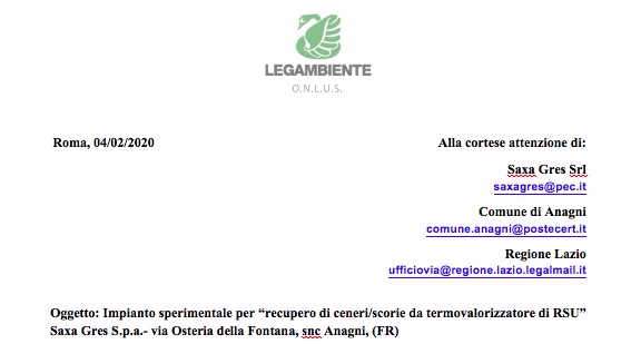 Pubblichiamo il testo delle osservazioni presentate da Legambiente, Ufficio Scientifico Nazionale e Circolo di Anagni, ed inviate il 4 febbraio 2020 alla società Saxa Gres, alla Regione Lazio e al Comune di Anagni Oggetto: Impianto sperimentale per “recupero di ceneri/scorie da termovalorizzatore di RSU” Saxa Gres S.p.a.- via Osteria della Fontana, snc Anagni, (FR) Premesso … Leggi tutto SAXA GRES – le osservazioni di Legambiente sulla sperimentazione